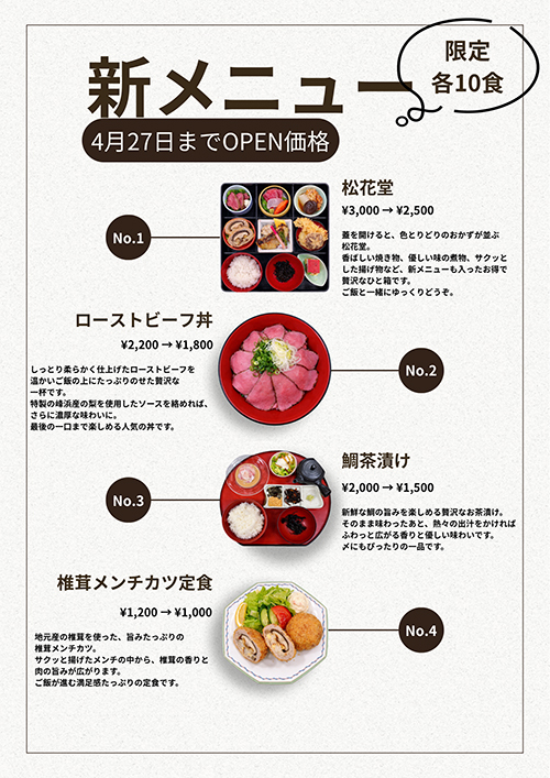 ランチ限定 各10食 4月27日までOPEN価格 ぜひお召し上がりください。